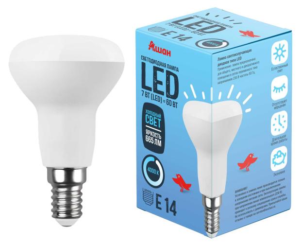 Лампа АШАН предназначена для общего, местного и декоративного освещения в сетях переменного тока напряжением 230В частоты 50 Гц. Технические характеристики: цоколь Е14, цветовая температура 4000К (холодный свет), мощность 7Вт (аналог 60Вт), световой поток 665Лм. Форма колбы - спот, высота лампочки - 85мм, диаметр лампочки - 50мм. Срок службы 30 000 часов.