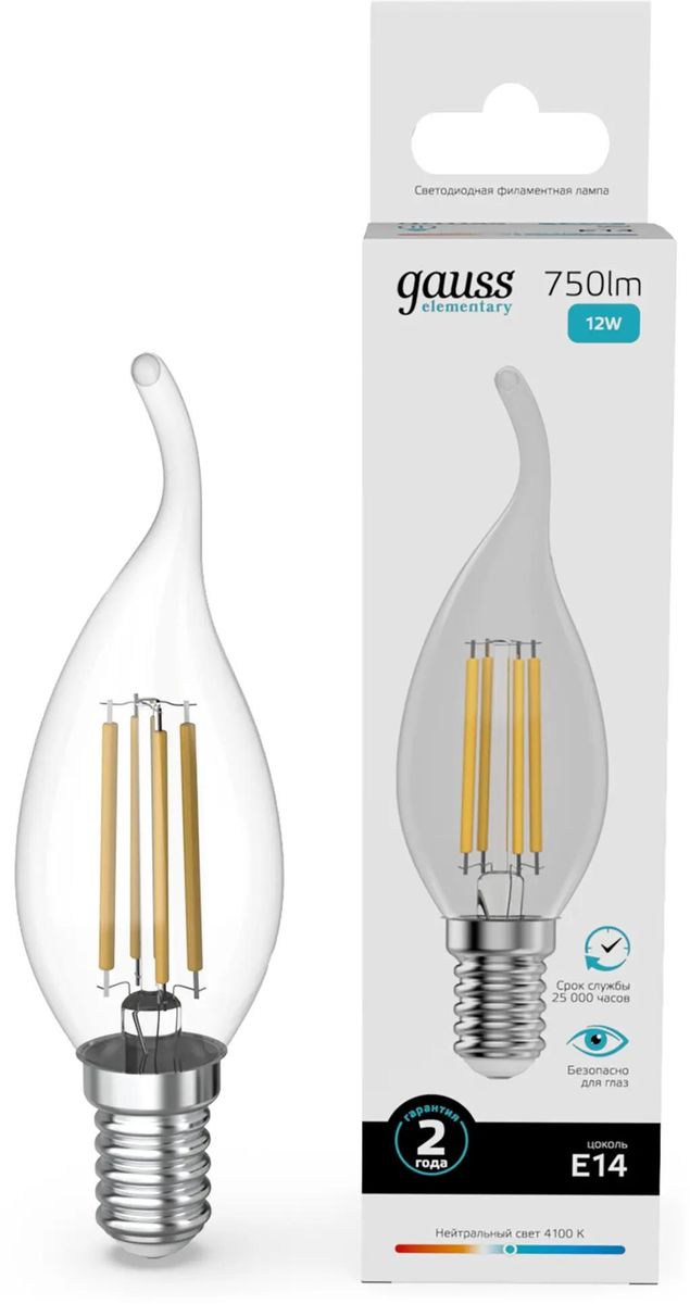 Лампа светодиодная E14 свеча на ветру, 12 Вт/белый нейтральный, 750лм, филаментная, 220 В, 10 шт., Gauss Filament (42122)
