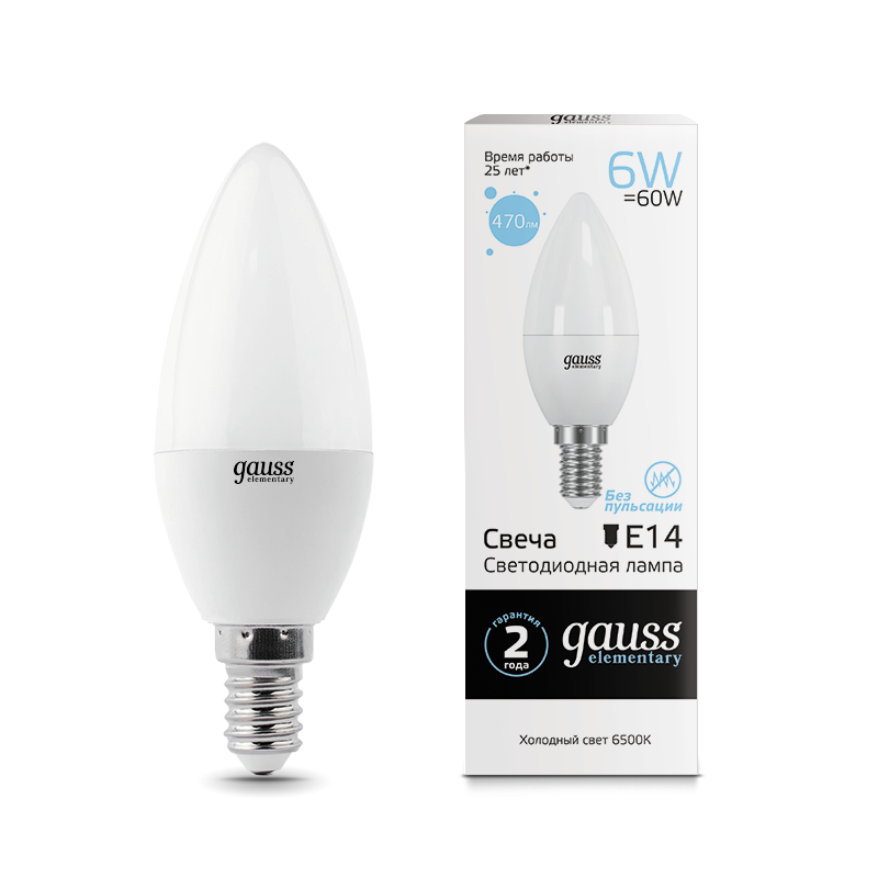 Лампа светодиодная E14 свеча, 6Вт, 6500K / холодный свет, 470лм, Gauss Elementary (33136)