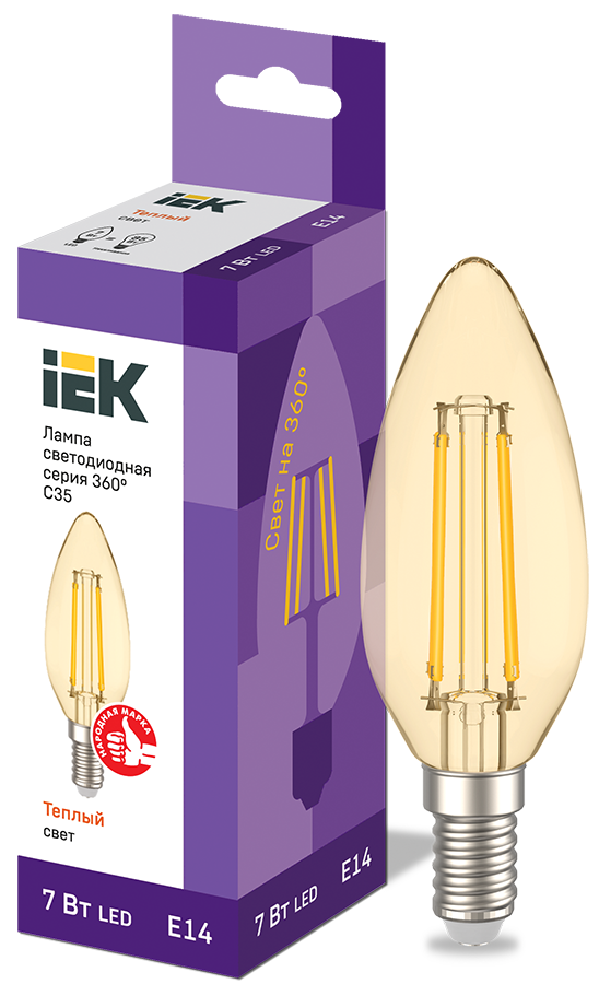 Лампа светодиодная E14 свеча/C35, 7Вт, 3000K / теплый свет, 630лм, филаментная, IEK 360° (LLF-C35-7-230-30-E14-CLG)