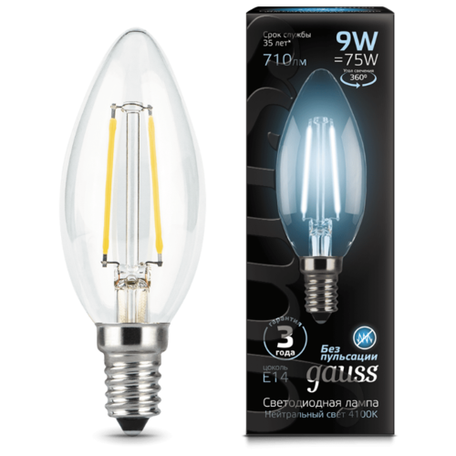 Лампа светодиодная E14 свеча/C35, 9Вт, 4100K / нейтральный свет, 710лм, филаментная, Gauss (103801209)