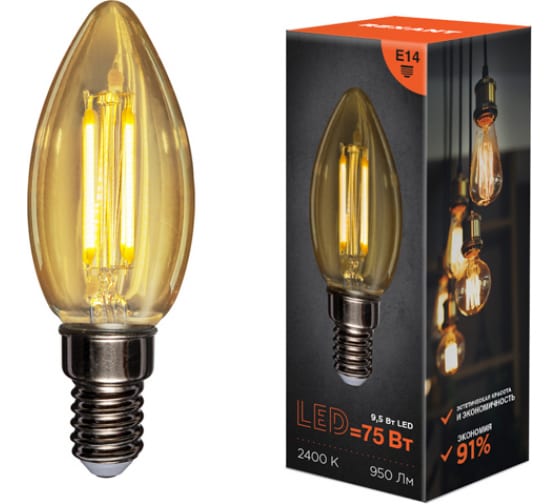 Лампа светодиодная E14 свеча/CN35, 9.5Вт, 2400 K / теплый свет, 950лм, филаментная, REXANT 604-099 (604-099), 604-099