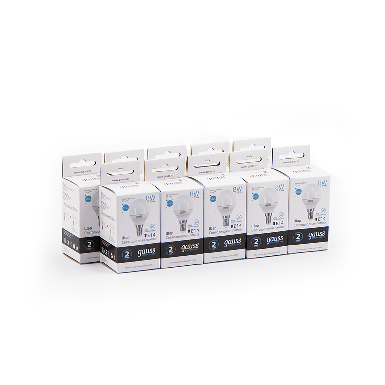 Лампа светодиодная E14 шар/G45, 8 Вт, 4100 K/нейтральный свет, 540лм, 220 В, 10 шт., Gauss Elementary (53128_10)