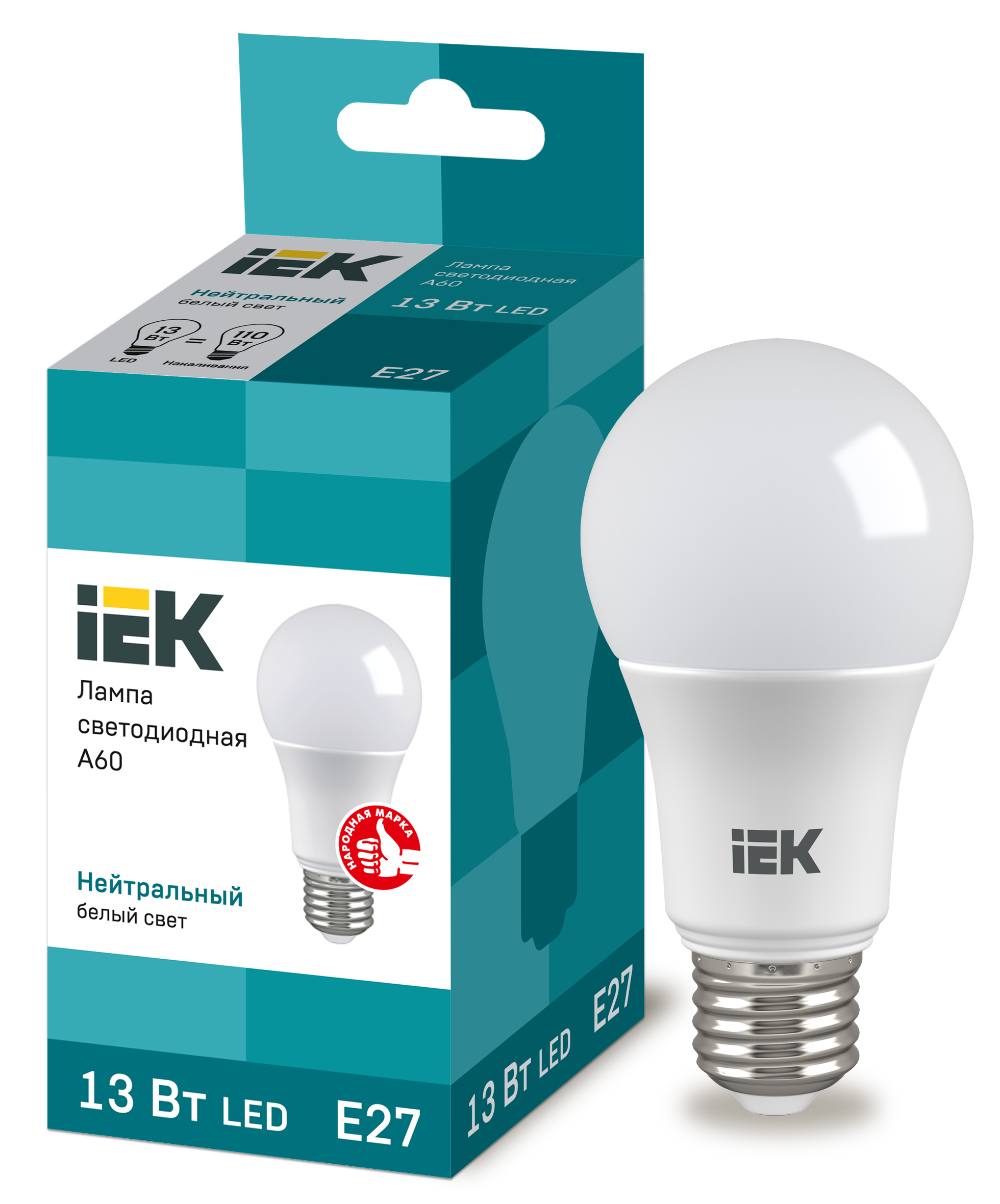 Лампа светодиодная E27 груша/A60, 13Вт, 4000K / нейтральный свет, 1170лм, IEK (LLE-A60-13-230-40-E27)