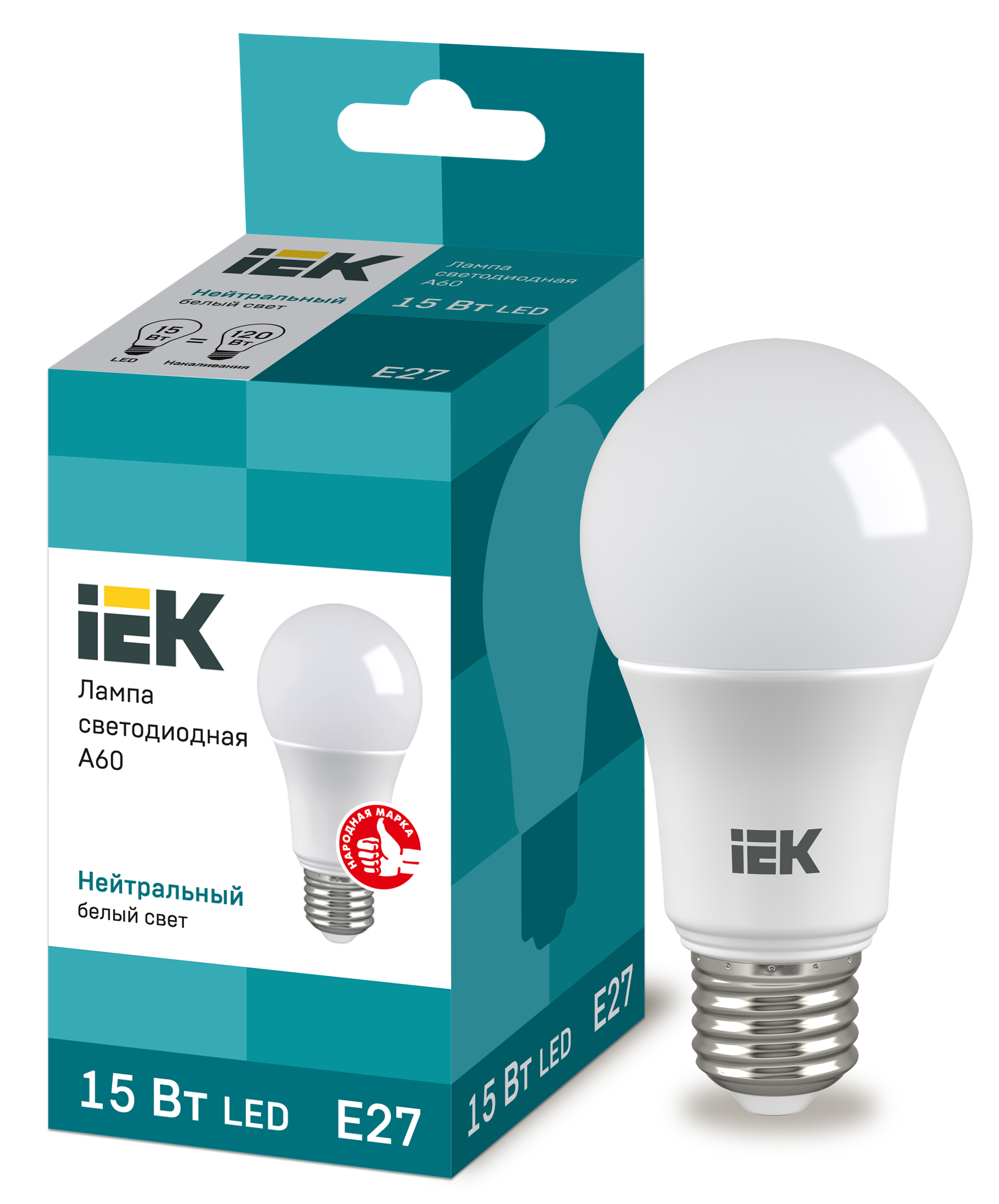 Лампа светодиодная E27 груша/A60, 15Вт, 4000K / нейтральный свет, 1350лм, IEK (LLE-A60-15-230-40-E27)