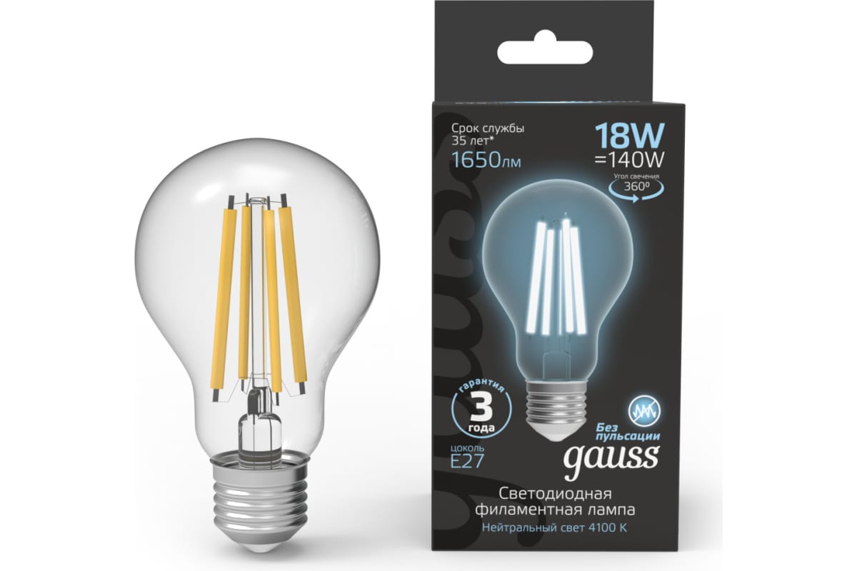 Лампа светодиодная E27 груша/A60, 18 Вт, 4100 K-4100 K / нейтральный свет, 1650лм, филаментная, 220 В, Gauss 102902218 (102902218), 102902218