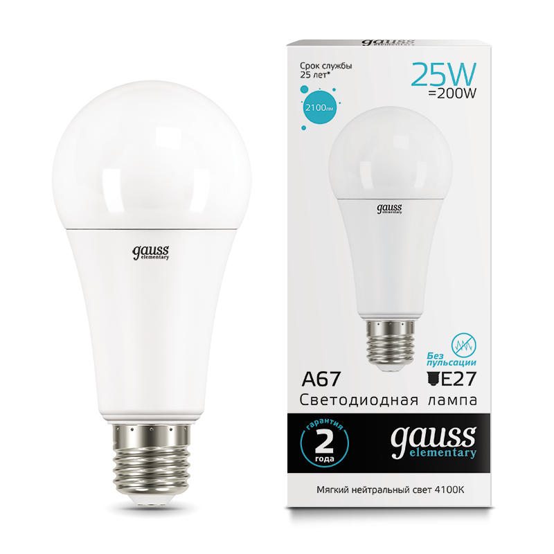 Лампа светодиодная E27 груша/A67, 25 Вт, 4100 K / нейтральный свет, 2100лм, 220 В, 10 шт., Gauss Elementary (73225_10)