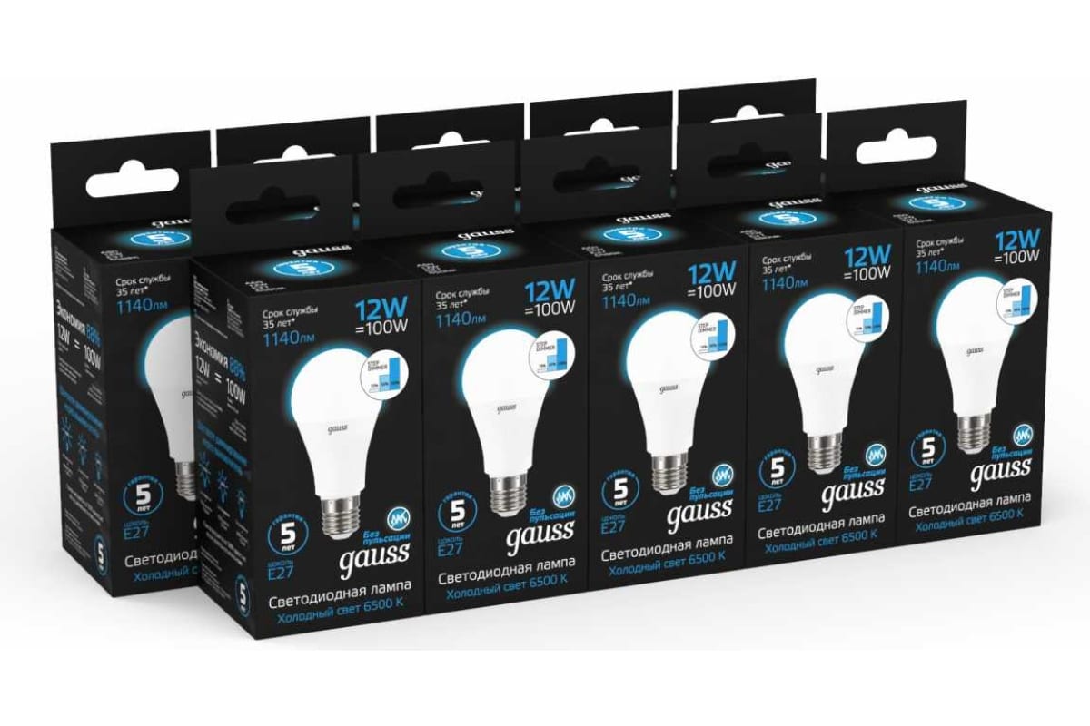 Лампа светодиодная E27 грушевидная/A60, 12 Вт, 6500 K / холодный свет, 1140лм, 220 В, 10 шт., Gauss (102502312-S_10)