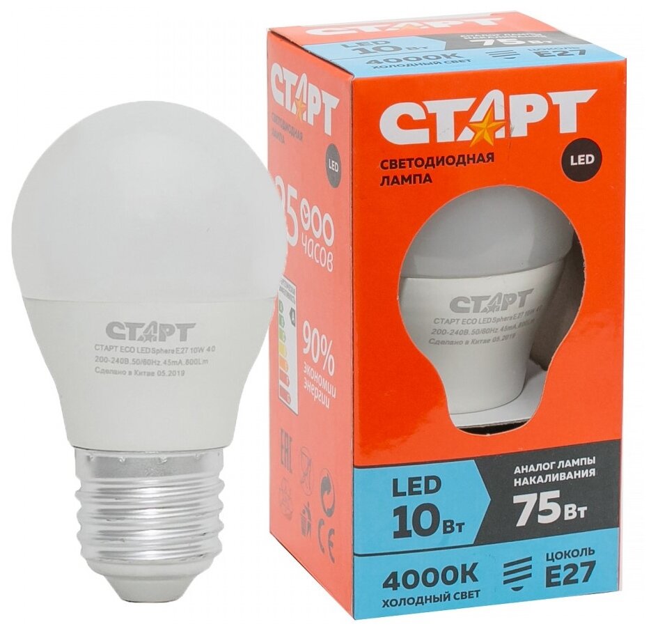 Лампа светодиодная E27 шар, 10 Вт / нейтральный свет, СТАРТ LEDSphereE27 (4640033427311)