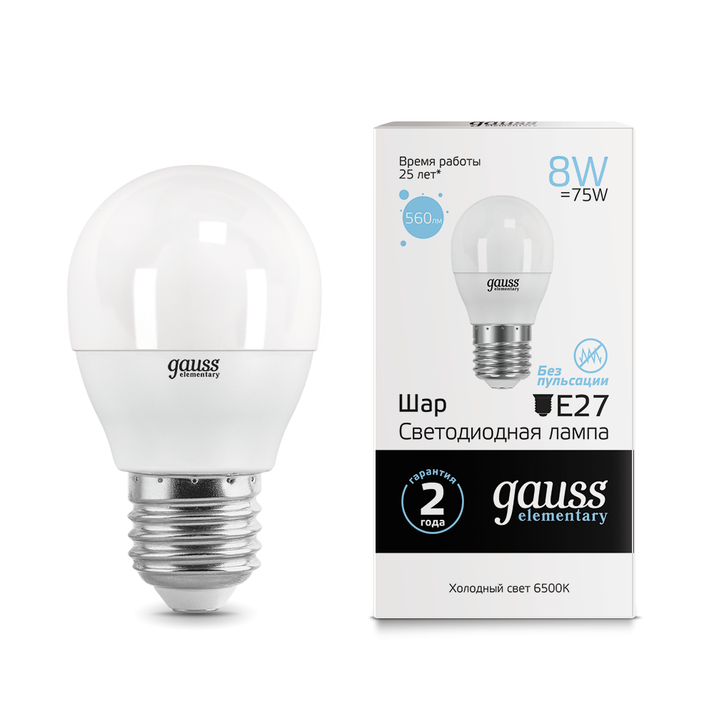 Лампа светодиодная E27 шар, 8 Вт, 6500 K-6500 K / холодный свет, 560лм, 10 шт., Gauss Elementary (53238_10)