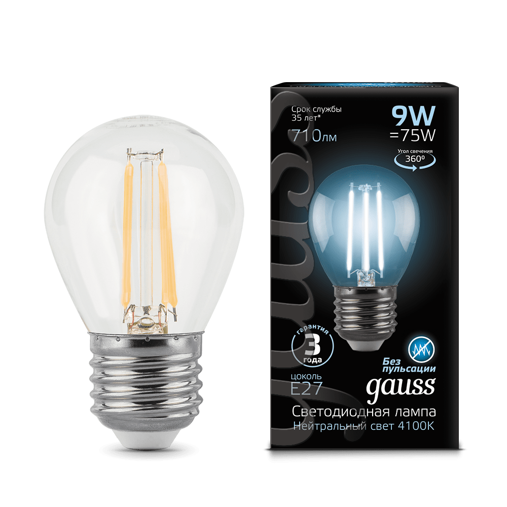 Лампа светодиодная E27 шар, 9Вт, 4100K / нейтральный свет, 710лм, филаментная, Gauss Filament (105802209)