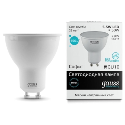 Лампа светодиодная GU10, MR16, 5.5Вт, 450лм, 4100K/нейтральный, 90 Ra, GAUSS (13626)