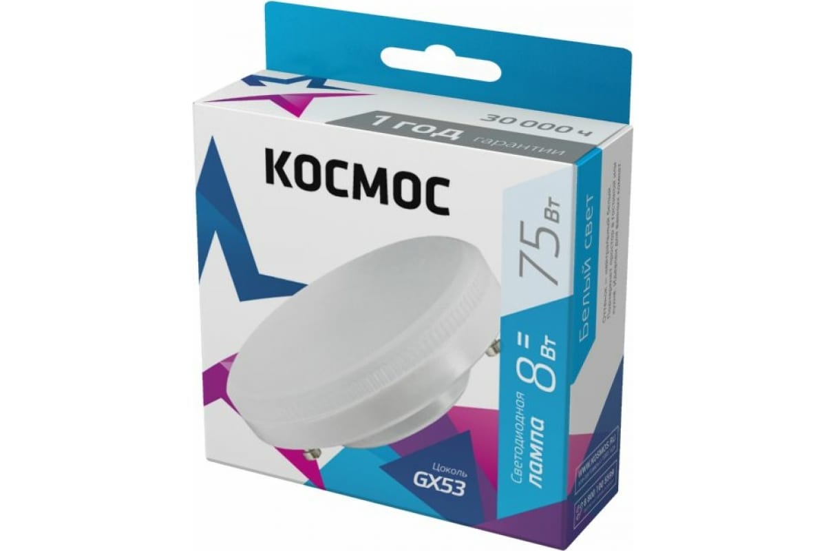Лампа светодиодная GX53, T75, 8Вт, 640лм, 4500 K/нейтральный, 80 Ra, КОСМОС Lksm_LED8wGX5345C (Lksm_LED8wGX5345C), Lksm_LED8wGX5345C