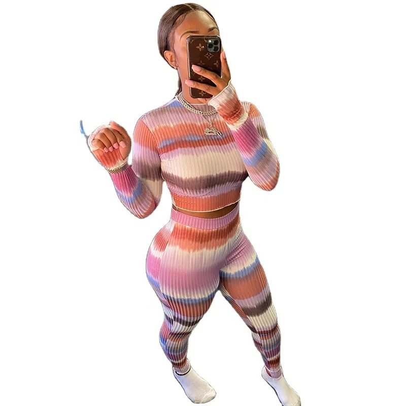 2021New Design Women's Casual Rainbow Printed Bodycon Skinny Long Sleeve Crop Top Pants Suits Tracksuits 2pc Set