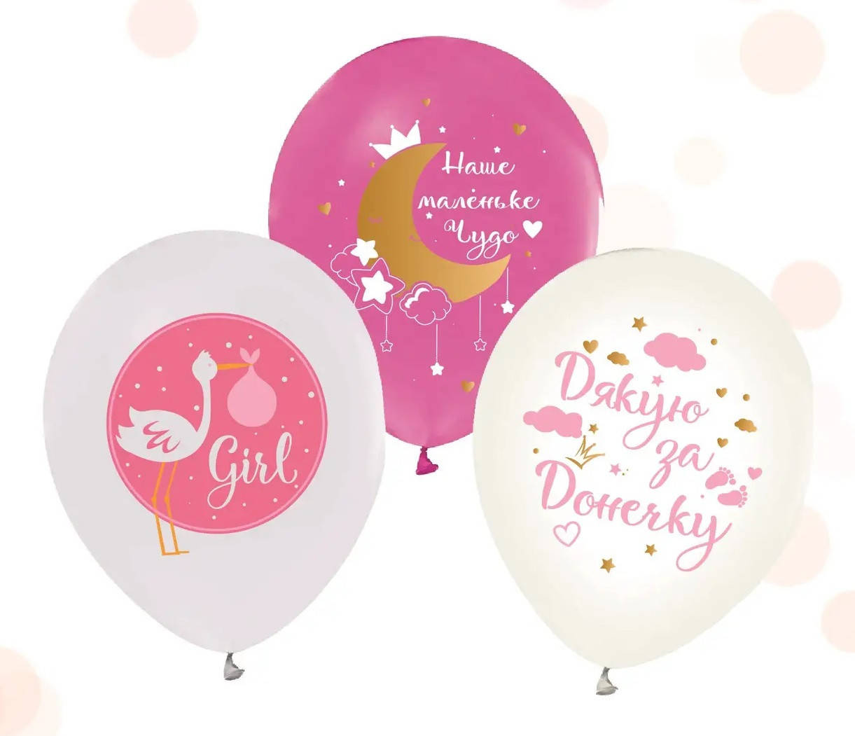 Шары из натурального латекса. Размер - 12" (30 см.) Производитель - Balonevi (Турция). Микс белого и розовых шаров с такими надписями "Girl", "Наше маленьке чудо", "Дякую за донечку"