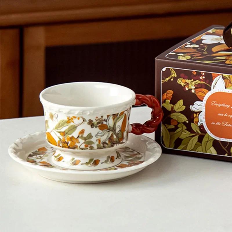 Легкий роскошный ретро керамический набор чашек и тарелок Высококачественная чашка для послеобеденного чая Кофейная чашка Домашний завтрак Изысканные цветы Молочная чашка