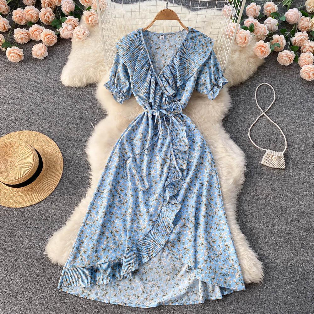 Легкое женское платье с v-образным вырезом и цветочным принтом в зрелом стиле, лето 2022, новое платье трапециевидной формы с нестандартным дизайном и оборками