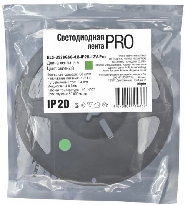 Лента светодиодная Navigator NLS-3528G60-4.8-IP20-12V-Pro 60LED/м, 4,8Вт, 12В DC, нарез. кр. 50мм, зеленый, IP20, 5м. в ролле (71436), NLS-3528G60-4.8-IP20-12V-Pro