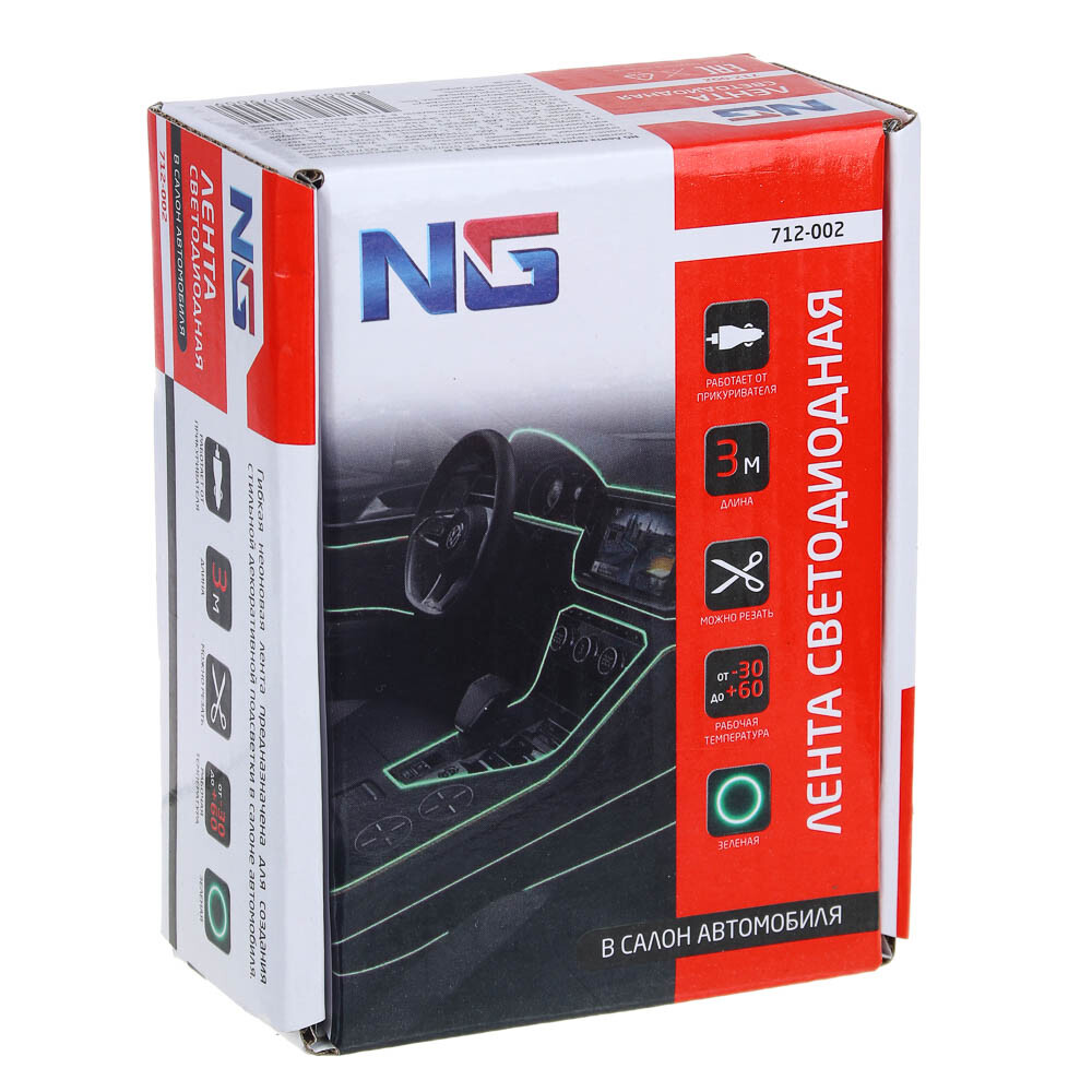 NG Лента светодиодная, зеленый 3м. Светодиодная лента NG зеленого цвета для декоративной подсветки салона автомобиля поможет создать особую атмосферу внутри вашего автомобиля, сделает салон более стильным, ярким и выразительным. Будет интересно смотреться в качестве обрамления приборной панели, а также на дверях. Лента легко монтируется, ее можно резать на нужную длину. Работает от прикуривателя. Подходит для всесезонного использования и выдерживает температуры от -30 до +60 градусов Цельсия.