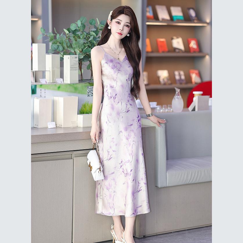 Летнее атласное платье-комбинация с цветочным принтом во французском стиле, облегающее, с поясом, элегантное, средней длины, женское XXXL фиолетовый