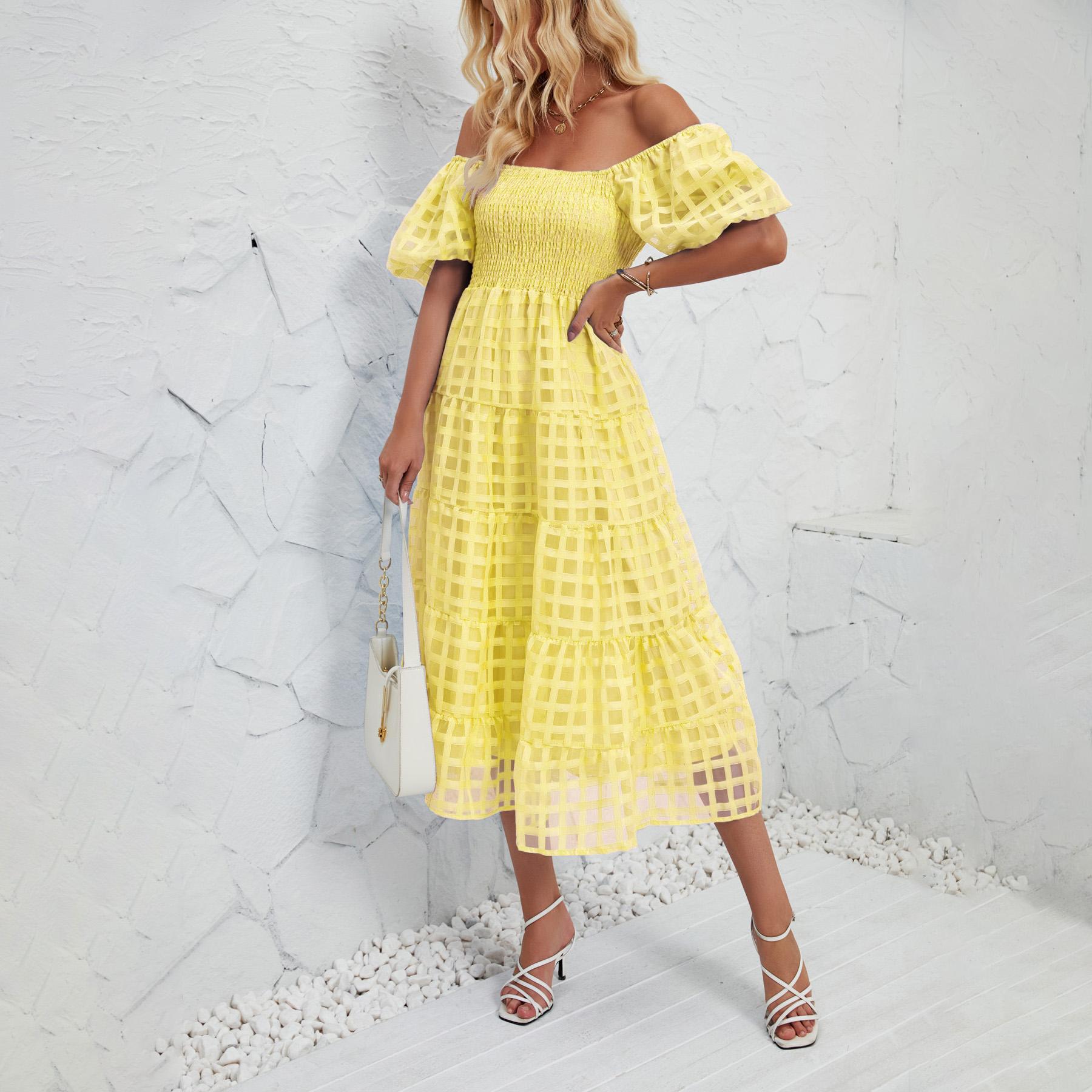 Летнее женское модное однотонное плиссированное платье длиной до щиколотки с короткими рукавами M светло-желтого