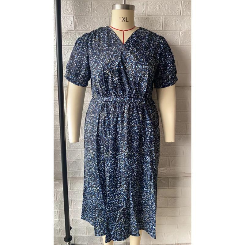 Летнее женское платье больших размеров с цветочным принтом и v-образным вырезом с коротким рукавом и завязкой на талии, тонкие большие распашные платья с принтом 5XL тёмно-синий