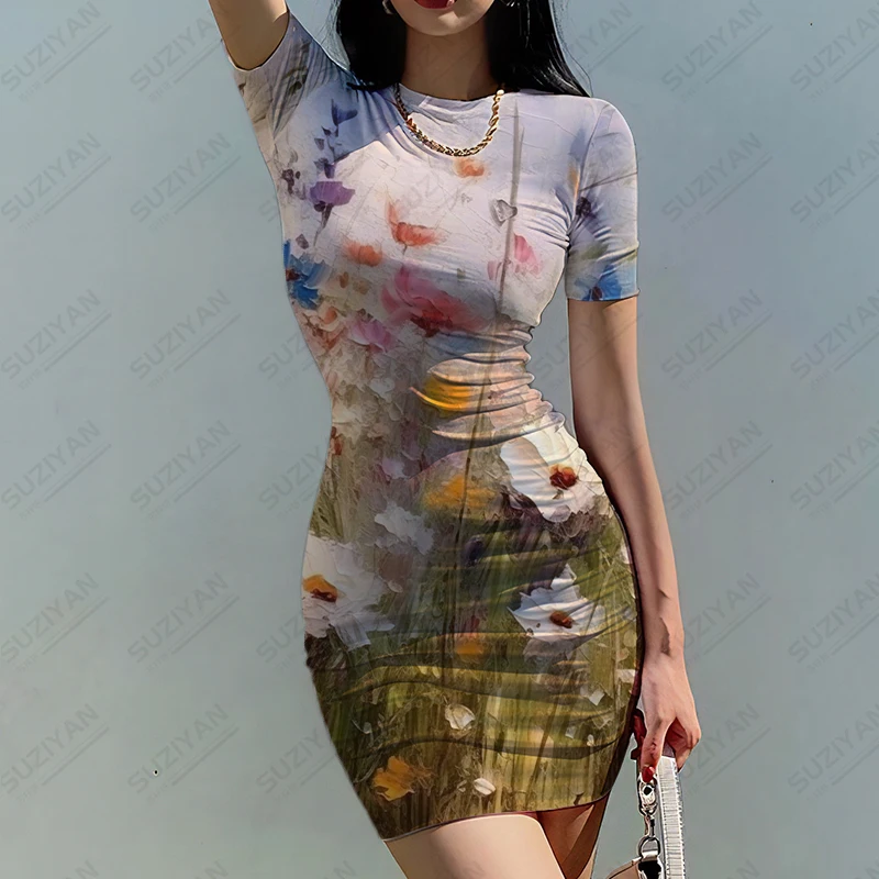 Летнее женское приталенное платье, женское платье с цветочным 3D принтом, стильное приталенное платье с рисунком маслом, Трендовое модное женское приталенное платье