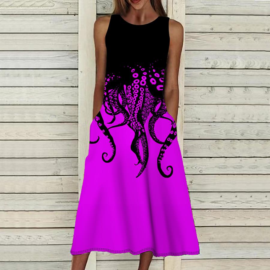Летнее модное сексуальное платье без рукавов, мягкое повседневное платье с 3D принтом осьминога, платье на бретельках без рукавов, летнее платье на подтяжках 8XL фиолетовый