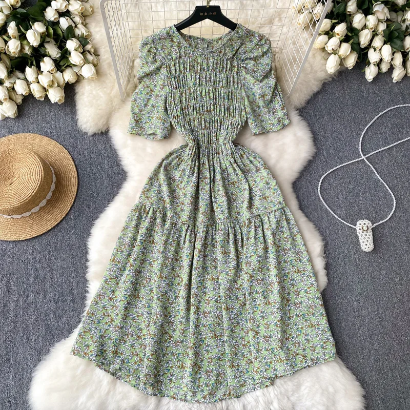 Летнее платье в пасторальном стиле с цветочным принтом, плиссированное приталенное платье средней длины с широкой юбкой