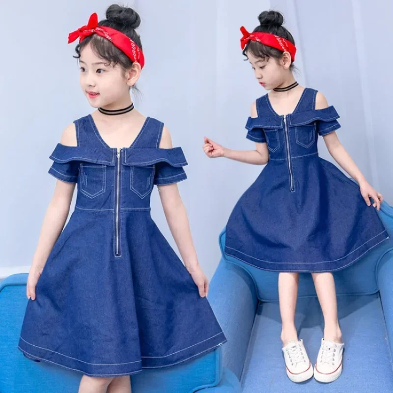 Летнее платье для девочек, модная джинсовая детская одежда с открытыми плечами, детское платье в Корейском стиле для девочек-подростков