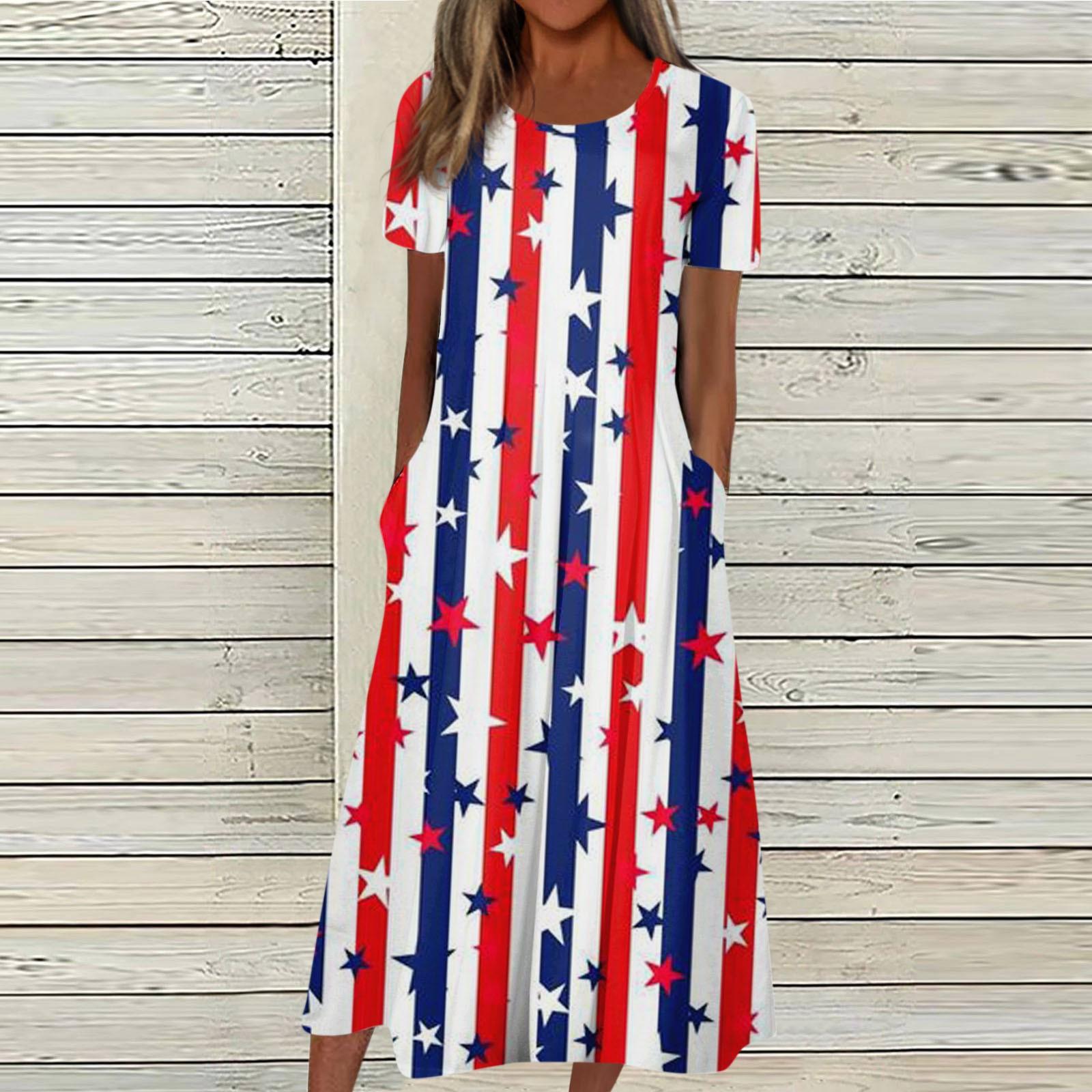 Летнее платье для женщин, повседневное пляжное свободное платье с v-образным вырезом и короткими рукавами с принтом на День независимости M красный