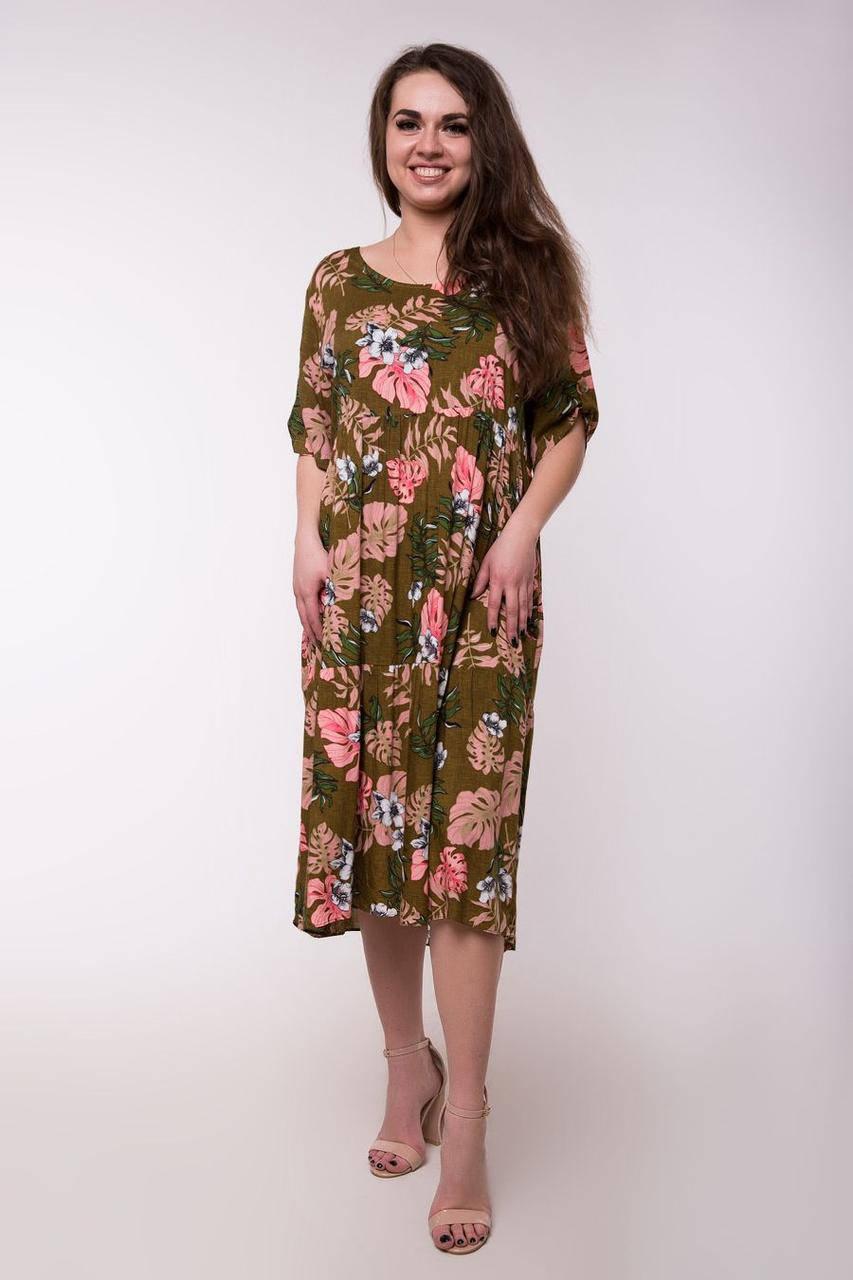 Летнее платье из штапеля больших размеров с растительным принтом C85S-30 хаки