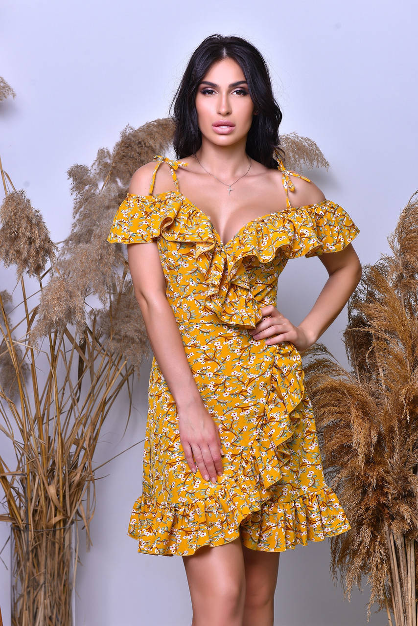Летнее платье на запах с рюшами в мелкий цветочный принт