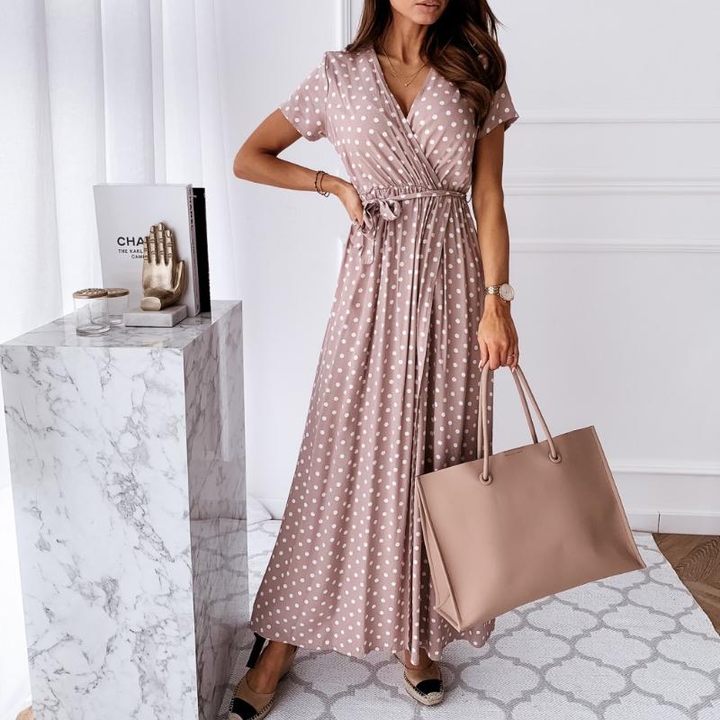 Летнее платье с коротким рукавом и V-образным вырезом в стиле бохо с принтом в горошек, длинное платье S розовый