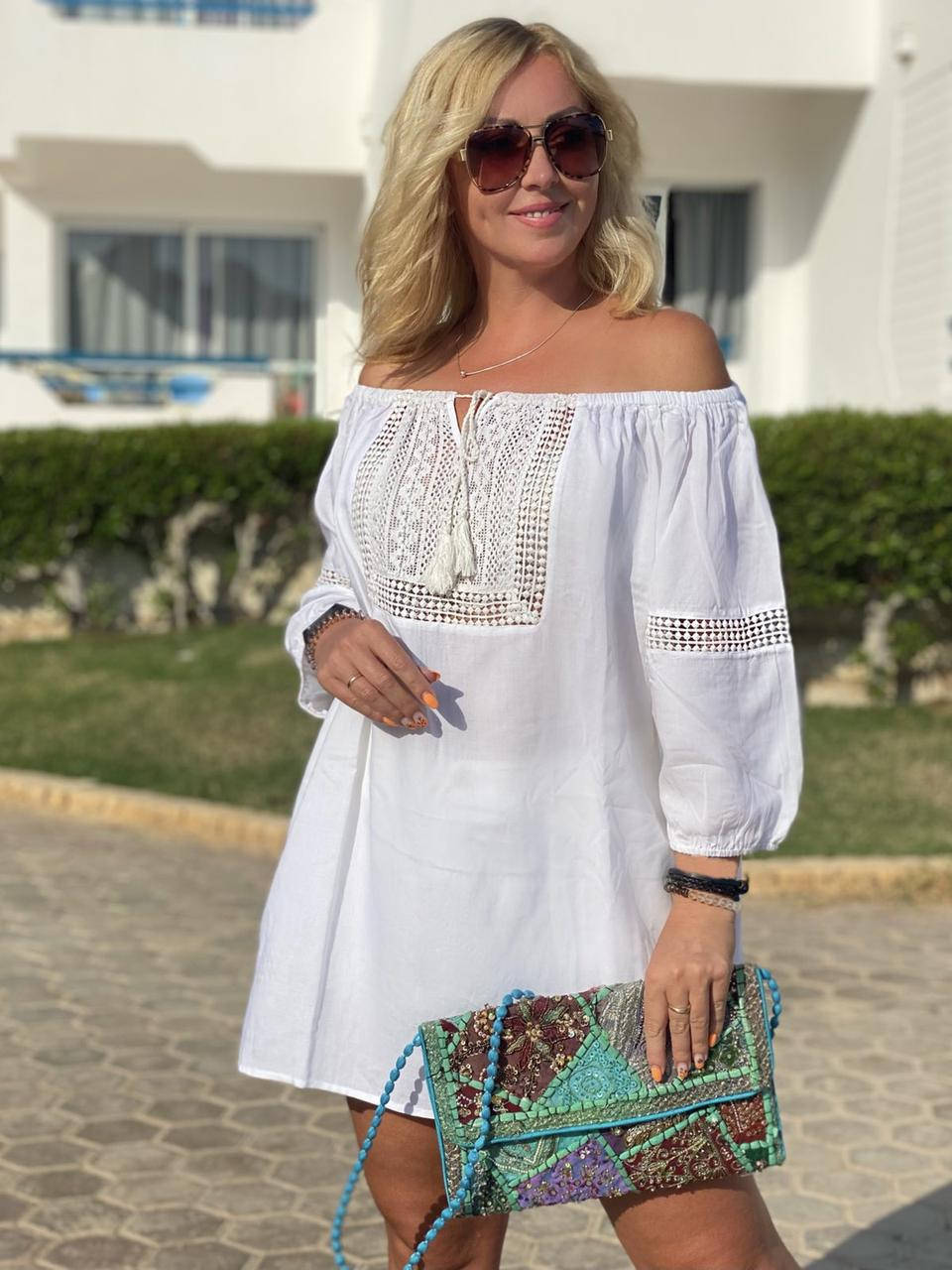 Женское платье туника с рукавами три четверти и открытыми плечами