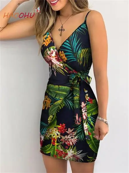 Летнее платье HAOOHU, Новинка лета 2021, платье-комбинация с цветочным рисунком, желательно стройнит, свободное сексуальное платье с V-образным в...