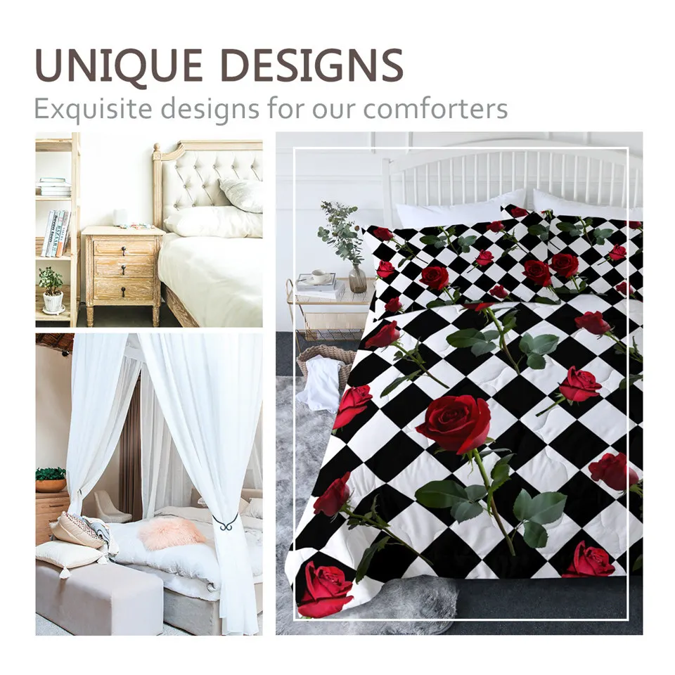 Летнее стеганое одеяло с цветами, в черно-белую клетку, 3 предмета