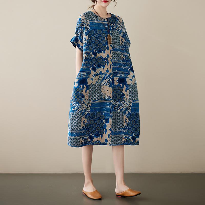 Летнее хлопковое конопляное ретро-художественное платье длиной до колена для женщин one size синий