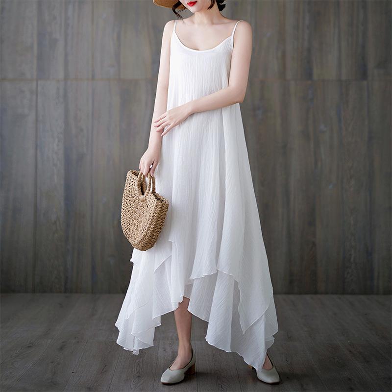 Летнее хлопково-льняное платье-комбинация 2025 года с неровным подолом - Двухслойная однотонная длинная юбка M белый