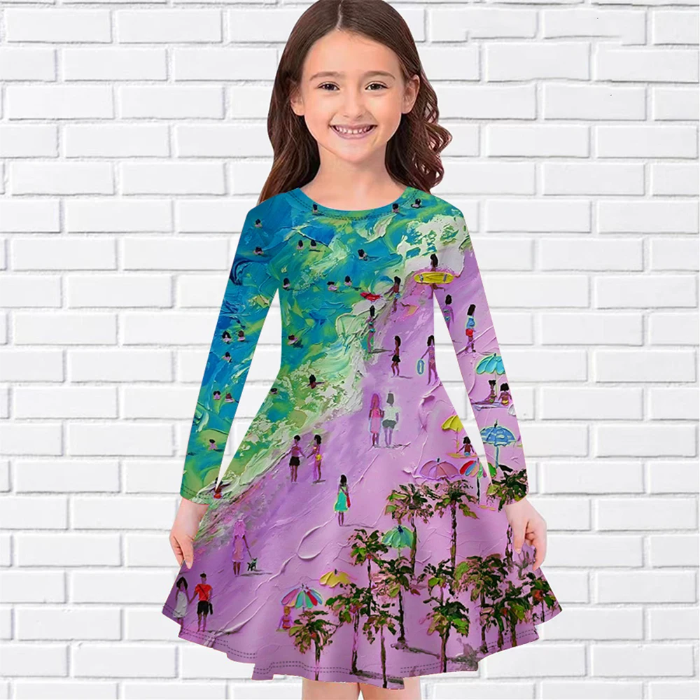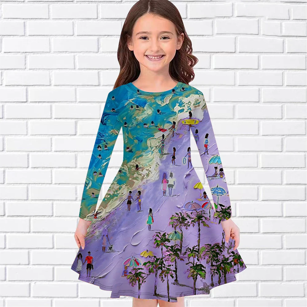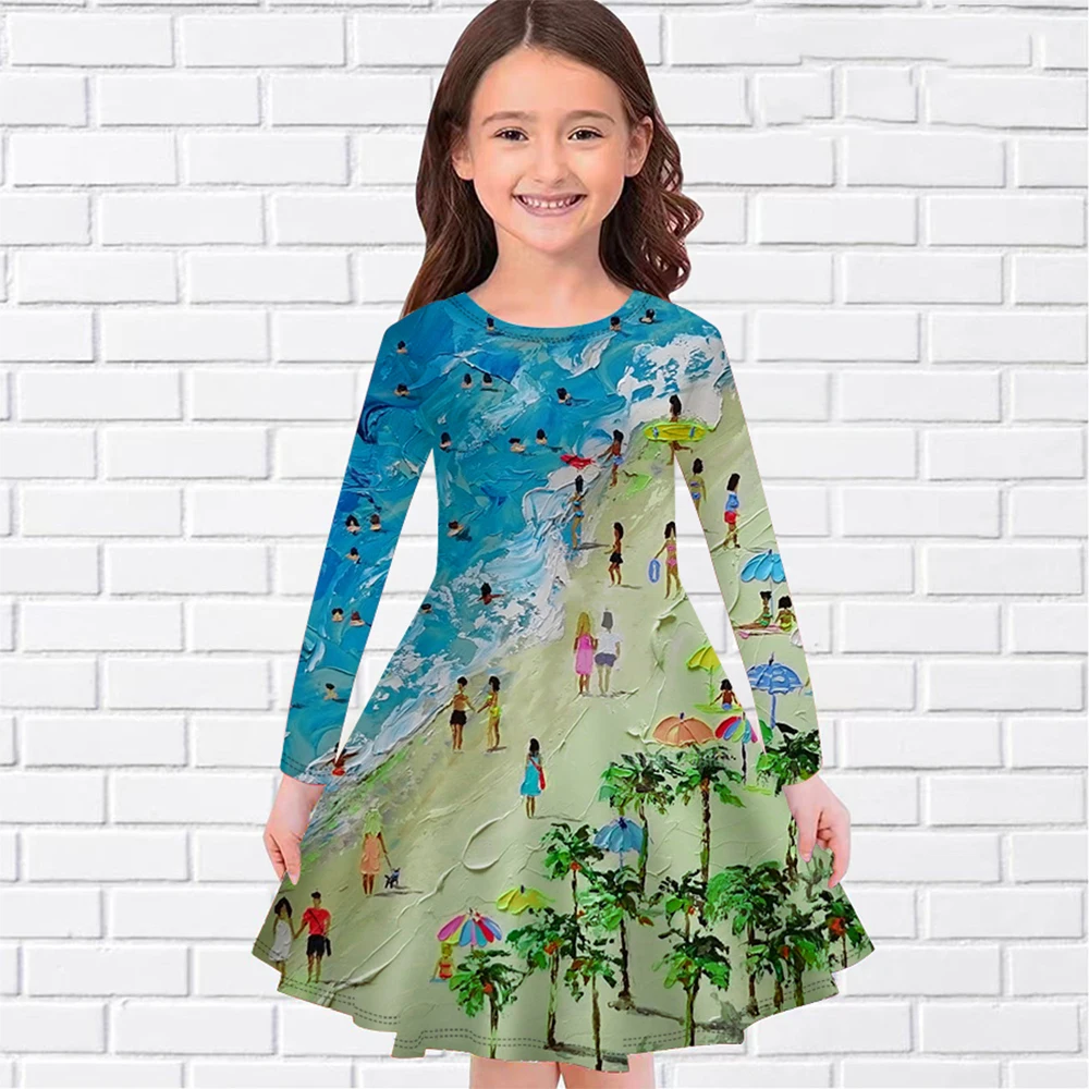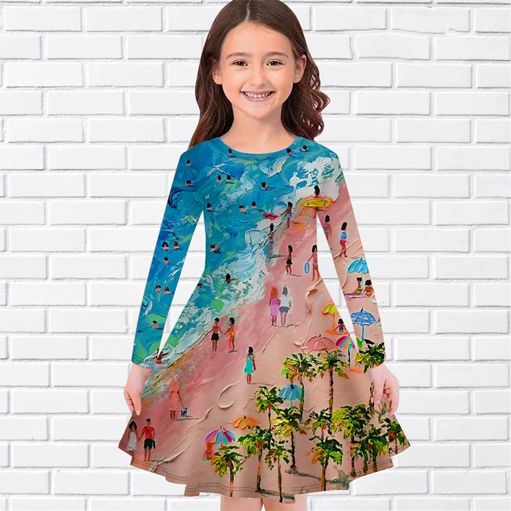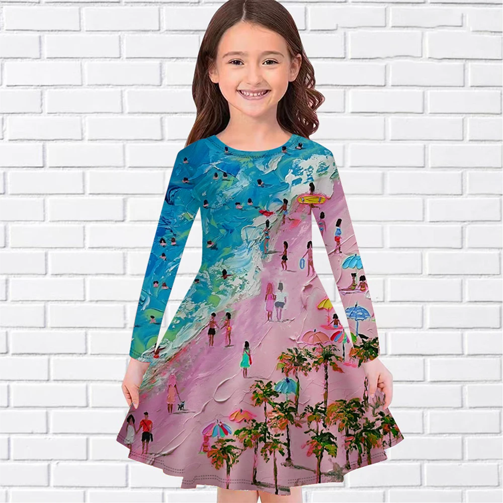 Летние Детские платья с круглым вырезом, длинным рукавом и 3D-принтом