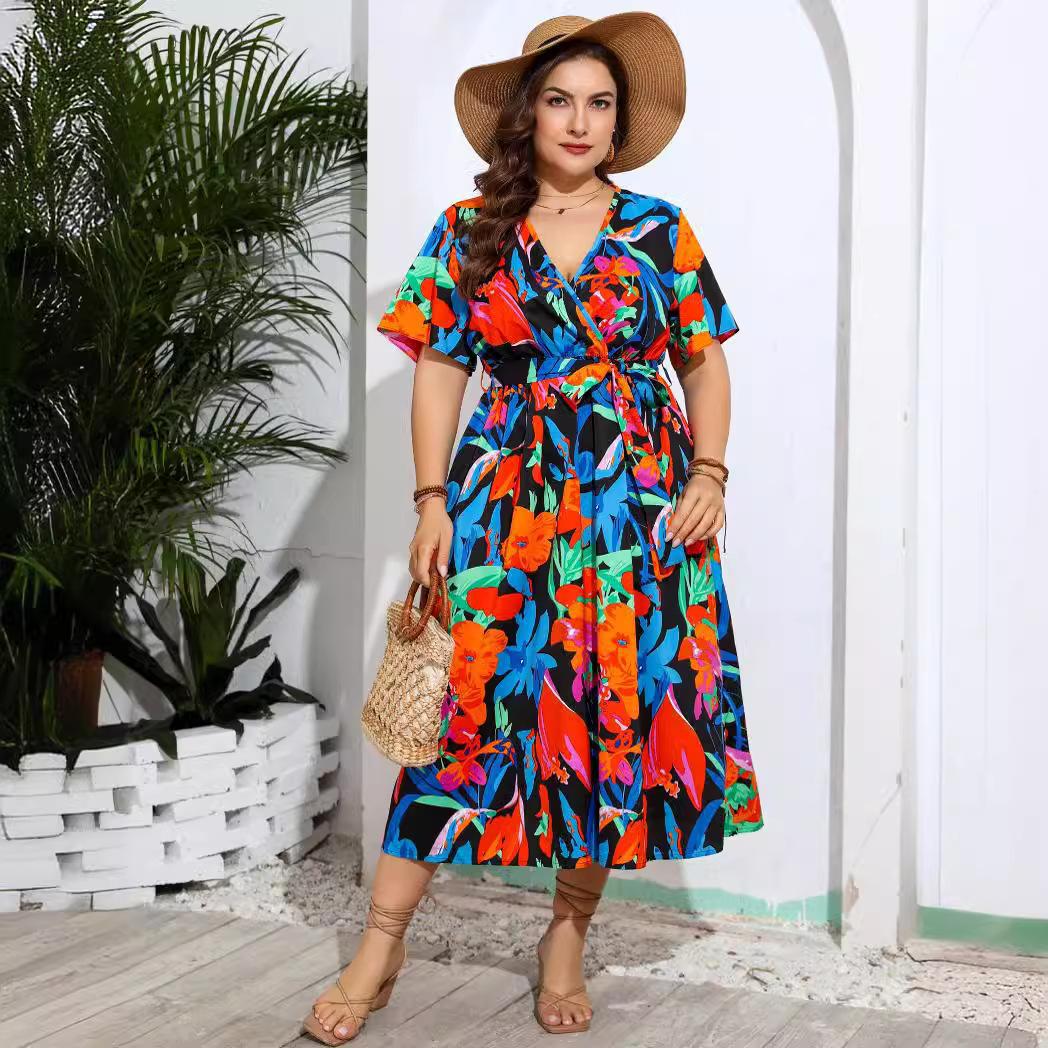 Летние женские праздничные пляжные платья больших размеров с v-образным вырезом и цветочным принтом 4XL чёрный
