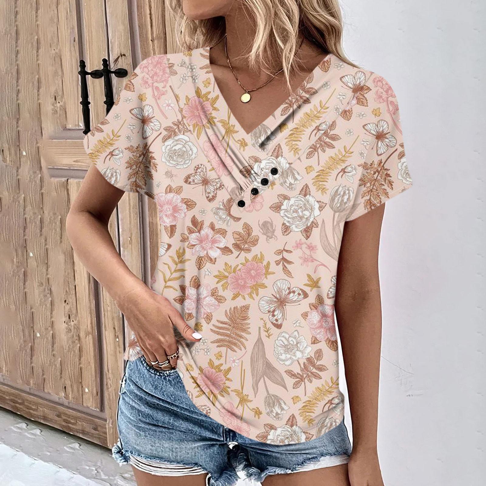Летние женские топы с цветочным узором для женщин, удобные женские топы с v-образным вырезом и короткими рукавами, футболки большого размера M хаки