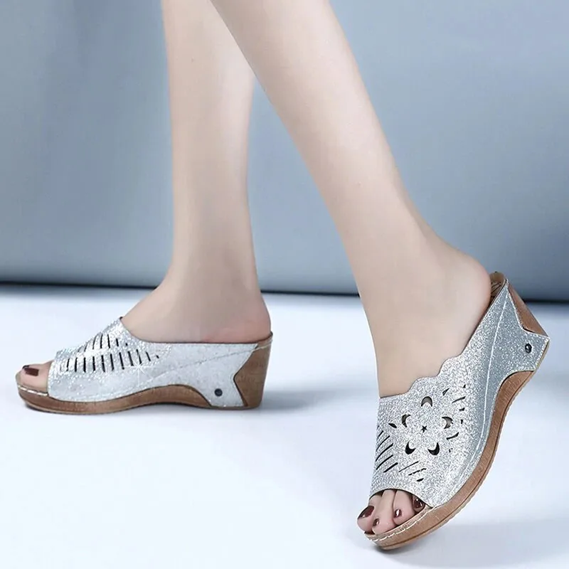 Летние женские туфли на танкетке на платформе с кристаллами шикарные сланцы с открытым носком Элегантные сандалии для улицы под платье Пов...