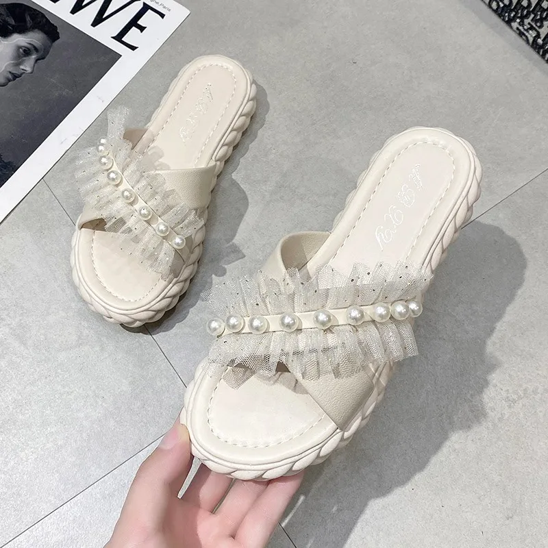 Летние женские шлепанцы из Жемчужной ткани с открытым носком на платформе с кружевной подошвой женские сандалии