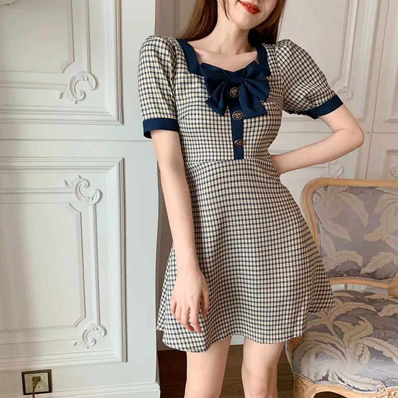 Летние клетчатые платья для женщин, милое женское платье с квадратным вырезом и высокой талией, халат с пышными рукавами, женские платья, це...