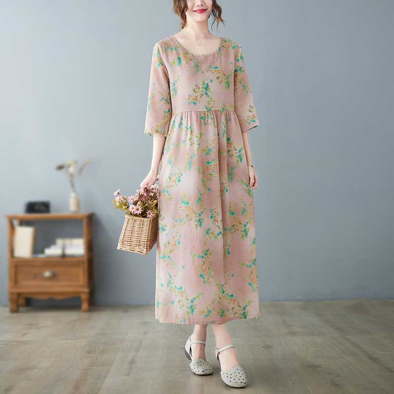 Летние новые литературные женские платья большого размера с круглым вырезом и рукавом пять минут, уменьшающие возраст 2XL розовый
