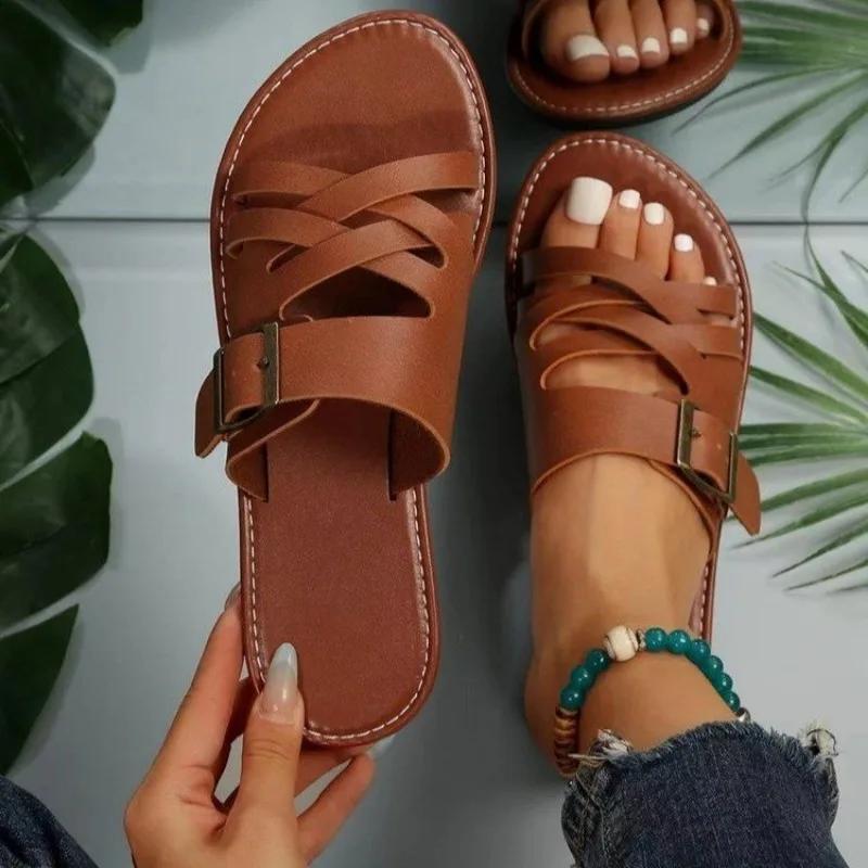 Летние однотонные сандалии на плоской подошве Popula 2024, уличные тапочки с открытым носком, пляжная женская обувь, большие размеры, шлепанцы Zapatos De Mujer 43 шоколадный