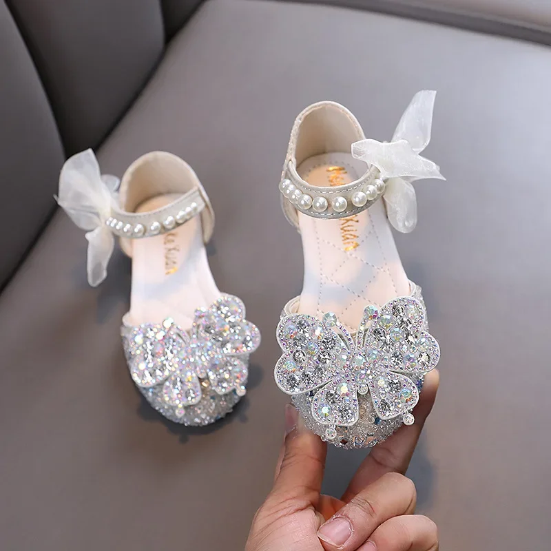 Летние сандалии для маленьких девочек, новинка 2024, Детские Балетки принцессы с бабочками и стразами, модные элегантные Детские Классические сандалии с блестками