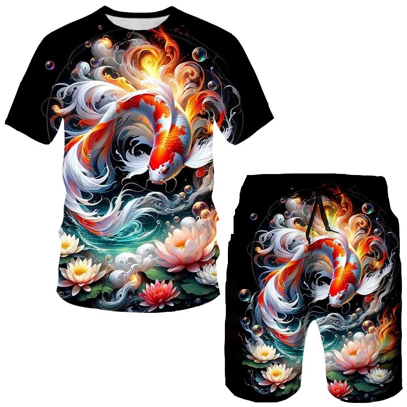 Летние футболки с принтом карпа кои 3D, шорты, комплекты, мужские спортивные костюмы, свободные футболки с коротким рукавом и штаны, комплект, мужские костюмы, одежда L