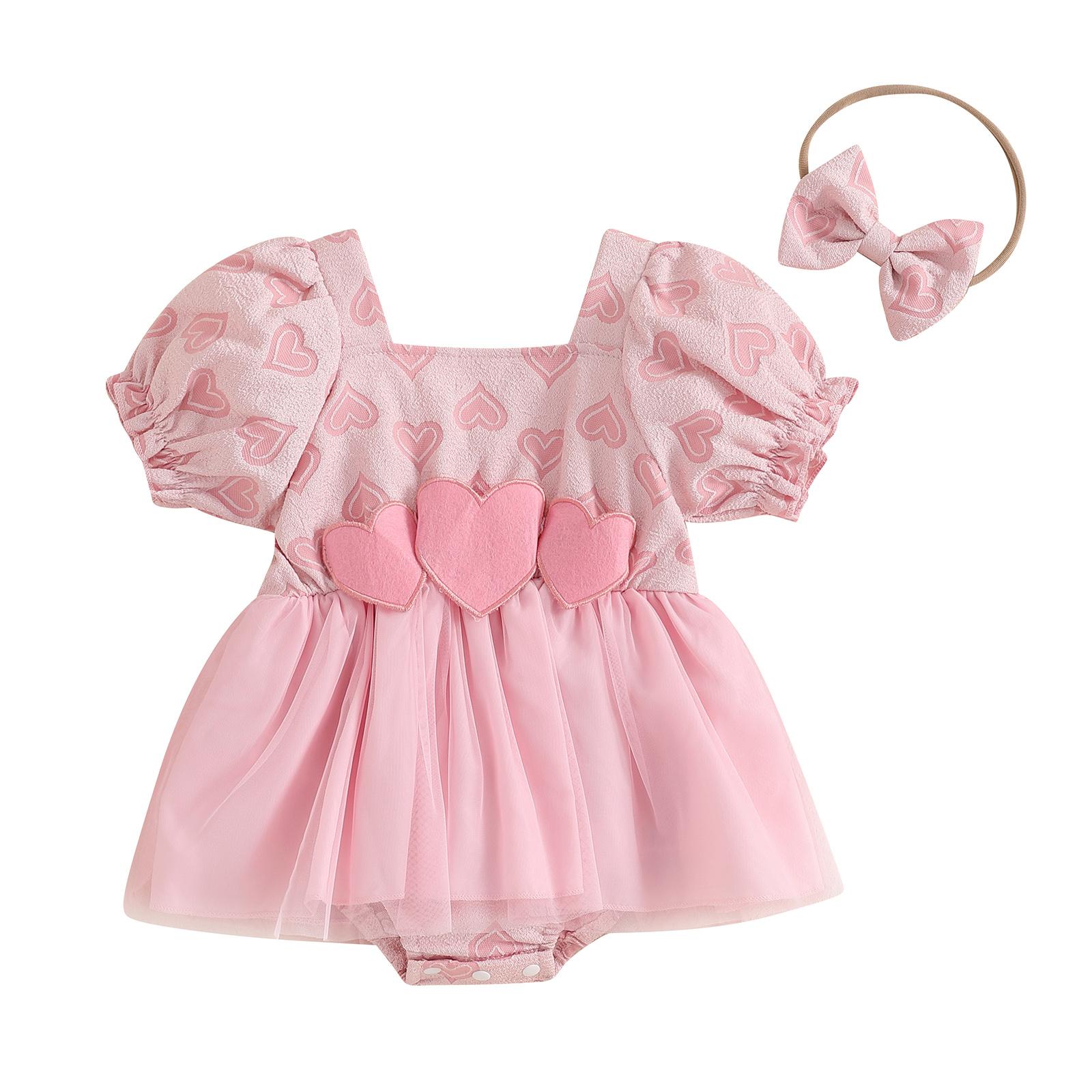 Летний комбинезон для девочки с короткими рукавами-фонариками, квадратным вырезом, узором в виде сердца и повязкой на голову с бантом 12-18 Months розовый